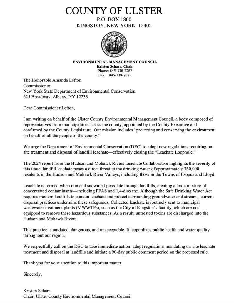 The Ulster County Environmental Management Council (EMC) has formally urged the New York State Department of Environmental Conservation (DEC) to take immediate action to protect public health and water quality by closing the “Leachate Loophole.”